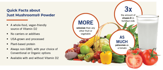 Mushroom powders contain important vitamins and nutrients, including five of the eight essential B vitamins, ergothioneine, vitamin D (when UV-B exposed), beta-glucans, selenium, and more.