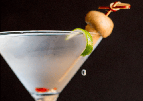 - In mixing glass or cocktail shaker filled with ice, combine gin and vermouth. Stir well, about 20 seconds, then strain into martini glass. Garnish with marinated mushroom and lime twist